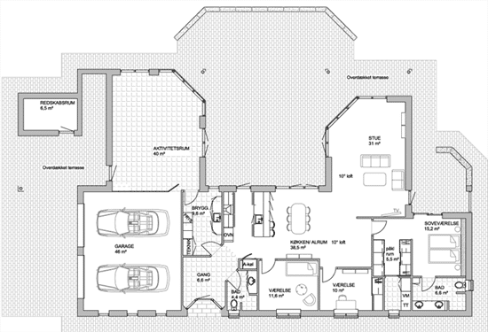 Hus med dobbelt garage, indmuret postkasse og renovationsskjul. Stue med godt lysindfald. Bemærk her frisekanten. Romantisk soveværelse med opmuret hylde og stjernehimmel. Stort køkken/alrum med mange smarte detaljer samt 10° Troldtekt loft. Funktionelt badeværelse med 2 vaske og stort spejl.